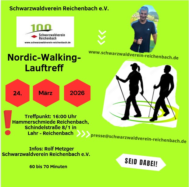 Nordic-Walking-Lauftreff im Schwarzwaldverein Reichenbach e.V. mit Rolf Metzger immer am Dienstag- Sommer 18:00 Uhr bis 19:00 Uhr Treffpunkt an der Hammerschmiede Reichenbach- Schindelstraße 8/1