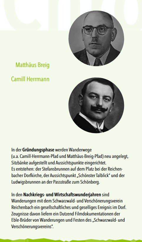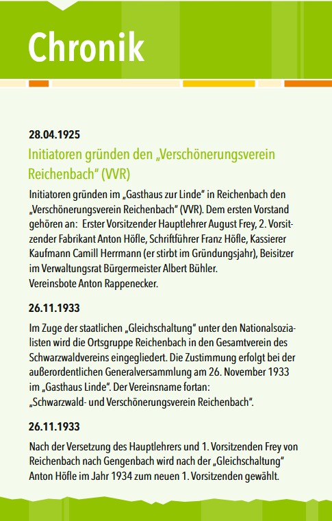 Der Schwarzwaldverein wurde im Jahre 1925 als Verschönerungsverein gegründet, im Jahr 1933 musste sich der Verschönerungsverein dem Schwarzwaldverein anschließen. Er nannte sich bis zum Jahr 2010 Schwarzwald- und Verschönerungsverein Reichenbach, ab 2010, nach einer Satzungsänderung, nur noch Schwarzwaldverein Reichenbach.